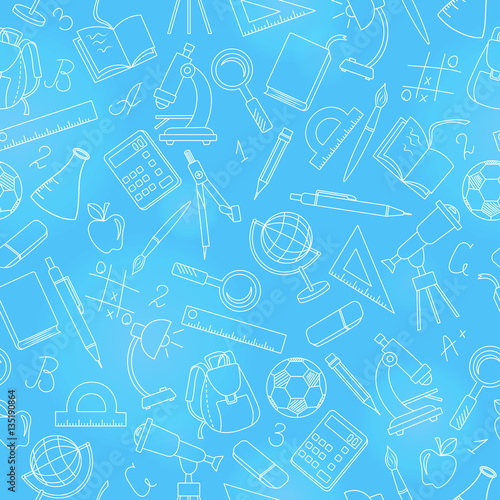seamless, background, pattern, school, subject, inventory, membership, training, education, party, infinite, globe, ball, crayons, ruler, microscope, eraser, pen, book, backpack, lamp, icon, simple, magnifier, compass, brush, year, september, autumn, outline, telescope, test tube, apple, blue