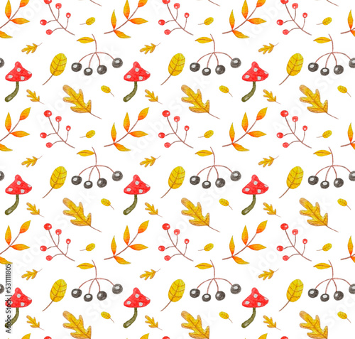 Seamless pattern with autumn leaves and berries. Watercolor pattern on the theme of autumn