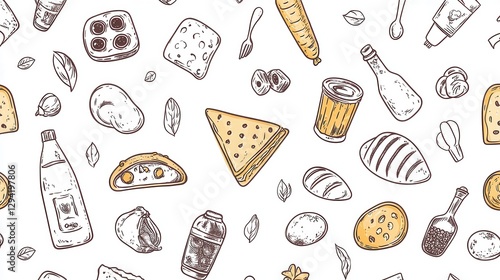 food, icon, seamless, pattern, hand-drawn, design, illustration, digital artwork, collection, vegetable, fruit, bakery, drink, sushi, iconography, graphic, wallpaper, background, art, stylised, crop, nourishment, healthy, colours, trendy, simple, minimalistic, repetitive, cute