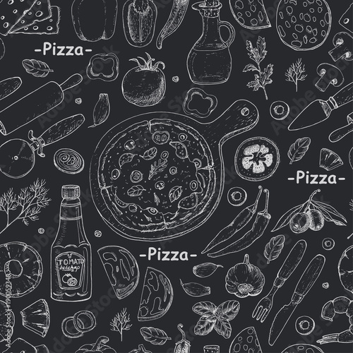 background, collection, drawing, food, fresh, healthy, illustration, ink, lunch, menu, set, shop, vignetting, delicious, vector, on black, tomatoes, garlic, parsley, bell pepper, basil, cheese, olive, pizzeria, dill, mushroom, ketchup, sausage, ham, pineapple, pepper, onion, shrimp, chili, pizza, hot, eatery, cookery, cooking, seamless