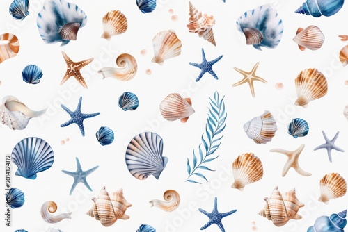 Seamless pattern with seashells and waves in ocean colors in watercolor style.