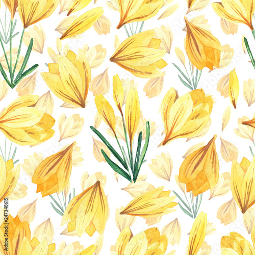 Seamless pattern with watercolor crocuses. Spring bright flowers. Seamless background.