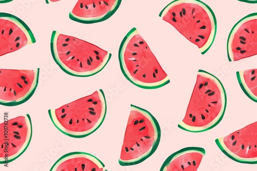 Seamless pattern with watermelon slices on a black background, flat vector illustration. For t-shirt prints and other uses.. Beautiful simple AI generated image in 4K, unique.