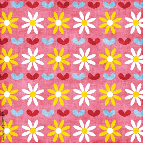 Seamless pink floral and hearts pattern with white and yellow daisies and red and blue hearts, cute spring or Valentine background for kids fabric, wrapping paper, cards and party decor.