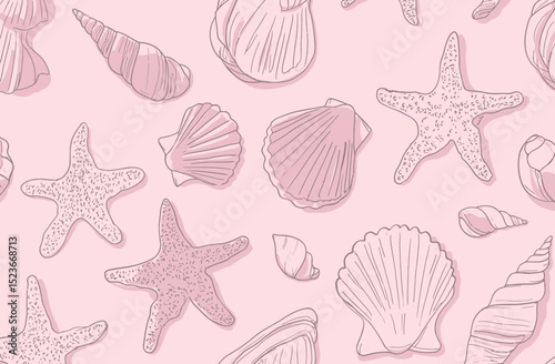 Seamless Pink Seashell and Starfish Pattern Vector Illustration