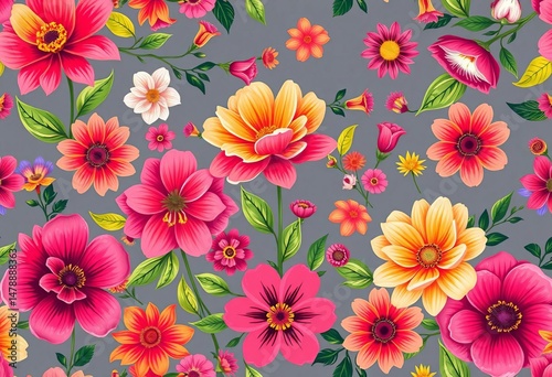 Seamless vector pattern featuring vibrant garden flowers on a solid background, ideal for textile prints and digital designs, blue, repeat