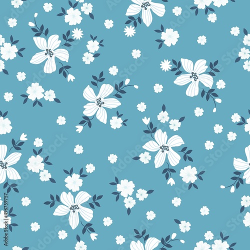 Seamless vintage pattern. white flowers, blue leaves. light blue background. vector texture. fashionable print for textiles, wallpaper and packaging.