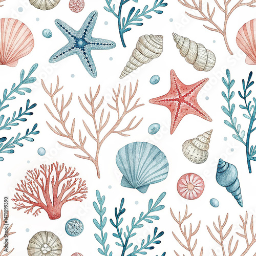 Seamless Watercolor Marine Pattern with Seashells, Coral, and Seaweed