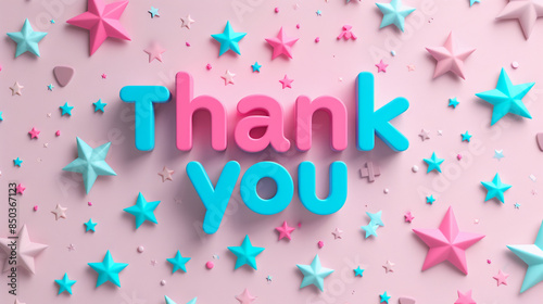 Search: 3d rendering of the text "Thank you" in pink and blue colors on light background with stars. Background is minimalistic, flat design, simple elements, colorful