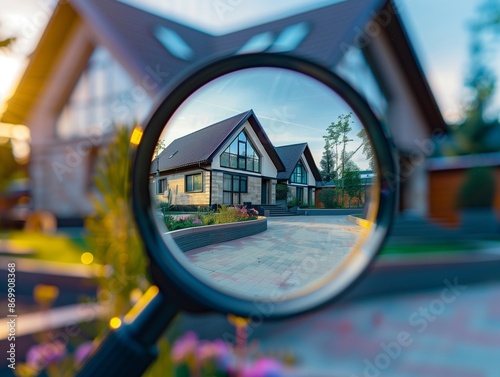 Searching new house for purchase. Rental housing market. Magnifying glass near beautiful house
