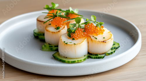 scallop, caviar, cucumber, seafood, seared, plated, epicure, fine dining, roe, starter, elegant, white plate, minimal, closeup, fresh, chives, dill, portion, eatery, culinary, gastronomy, tasting, presentation, texture, golden brown, indulgent, luxury