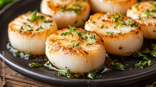 Seared Scallops with Herbs on Black Plate, Seafood , Gourmet