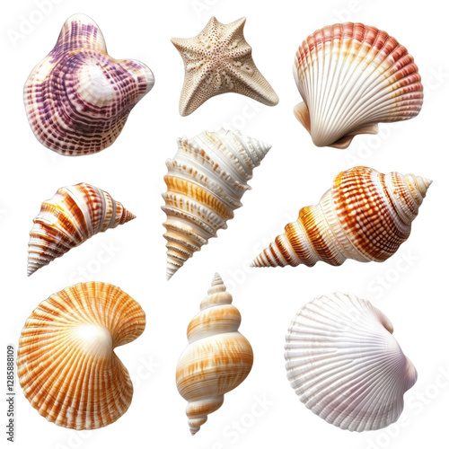summer, element, isolated, transparent, seashell, ocean, coastal, collection, marin, beach, nature, treasure, starfish, spiral, conch, mollusc, decorative, colourful, pattern, texture, shell, aquatic, oceanic, natural, wildlife, underwater, habitat, unique