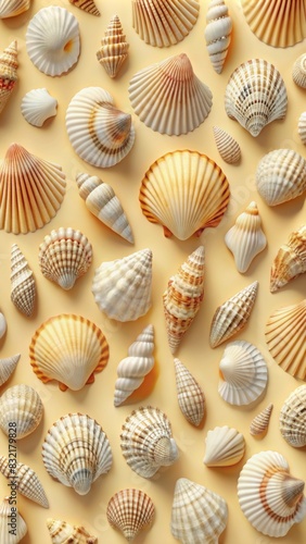Seashells pattern on beige background, top view. summer concept with seacell objects for your design. flat lay composition