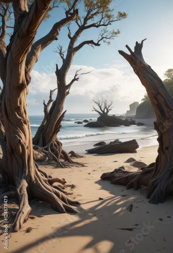 Seashore landscape with gnarled tree trunks and twisted branches, ocean, gnarled