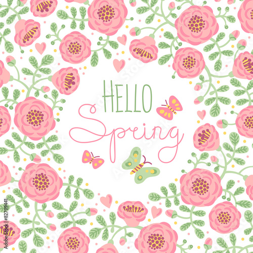 Season card Hello Spring with cute flowers and butterflies.