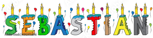 sebastian, name, first name, man, male, bitten, letter, font, birthday, cake, balloon, candle, alphabet, three-dimensional, spacial, colourful, doodle, text, typography, spelling, boy, word, decoration, light, celebration, anniversary, hand-drawn, illustration, cartoon, isolated, vector