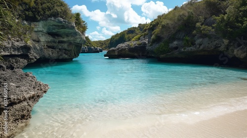 Secluded beach cove with turquoise waters surrounded by rocky cliffs under a clear blue sky