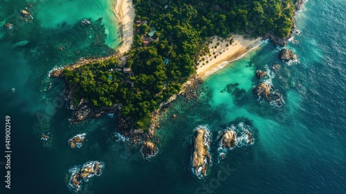 island, beach, ocean, tropical, paradise, aerial, view, shoreline, coast, sea, water, sand, rock, green, lush, vegetation, tree, jungle, turquoise, blue, teal, photo, drone, nature, landscape, travel, vacation, holiday, summer, get-away, scenic, beautiful, amazing, uninhabited, hidden, serene, calm, peaceful, exotic, remote