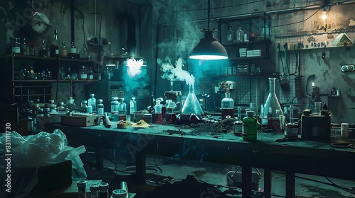 clandestine, laboratory, chemical, flask, bubbling, syringe, powder, bag, atmosphere, secretive, science, experiment, research, brew, test, potion, beaker, erlenmeyer, equipment, chemistry, illicit, underground, innovation, discovery, technology, scientific, method, investigation