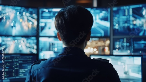 Security Guard Overseeing Urban Area Through Multiple CCTV Monitors in Dimly Lit Control Room with Blue Tones and Digital Displays