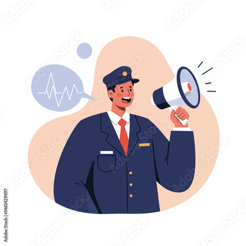 security, officer, megaphone, announcement, communication, uniform, hat, badge, speech bubble, heartbeat, alert, authority, man, person, professional, job, work, safety, protection, guard, control, signal, sound, voice, loud, public, alertness, business, vector, illustration, blue, red, orange, smile, face, talking, gesture, character, male, human, cartoon