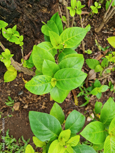 Seedlings of Pseuderanthemum Reticulatum plant in a garden. Also called Yellow-Vein Eranthemum, Golden Pseuderanthemum or Golden Net Bush. It is a species of evergreen shrub in the Acanthaceae family.