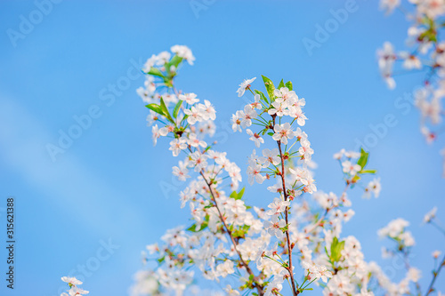 Selective focus beautiful cherry blossom in the garden against the blue sky.