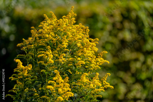 Selective focus of yellow flower Solidago canadensis with green leaves, Canada goldenrod or Canadian goldenrod is an herbaceous perennial plant of the family Asteraceae, Nature floral background.