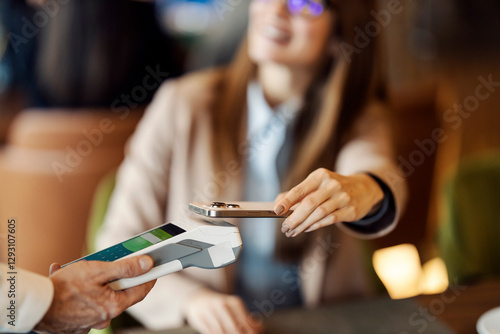 Selective focus on young woman's hand paying with mobile app on pos at coffee shop.