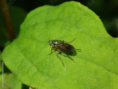 fly, female, diptera, metallic, eye, green, green eye, iridescent, gold, gold, long legs, leaf, summer, insect