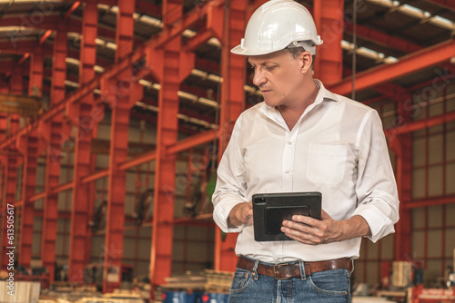 Senior caucasian male worker wearing helmet standing holding tablet working checking stock material in factory