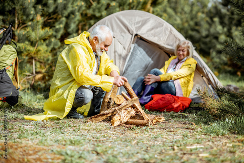 Senior couple in yellow raincoats making fireplace at the campsite near the tent in the woods