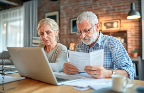 senior, couple, reviewing, financial, document, together, laptop, retirement, planning, budgeting, sharpened, concentration, concern, calculation, investment, savings, serious, partnership, responsibility, paperwork, computer, elderly, communication, analysis, home, strategy, bill, lifestyle, preparation, teamwork, discussion, connection, family, support, collaboration, future, pension, decision, expense, balance, money, guidance, accounting, care, stability, finance, detail, information, organisation