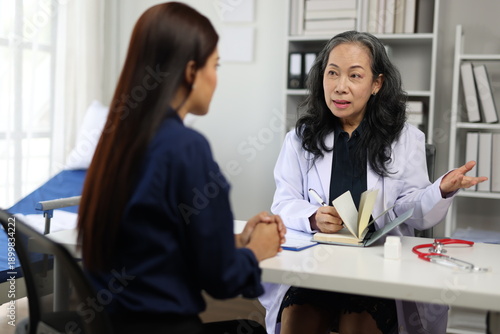 doctor, patient, hospital, health care, medicals, consultation, listening, writing, note, notepad, symptom, diagnosis, treatment, medicine, health, care, professional, clinic, exam, conversation, disease, disease, help, advice, expertise, life events, woman, female, senior, young, adult, sitting, desk, office, stethoscope, person, check-up, working, practitioner, nurse, appointment, physician, service, prescription, surgery, insurance, explaining, diagnostic, document
