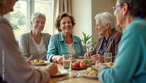 Senior friends enjoy lunch together in nursing home dining room. Communicating, laughing. Happy seniors enjoy meal together. Focus on cheerful woman. Positive atmosphere. Group of mature friends.