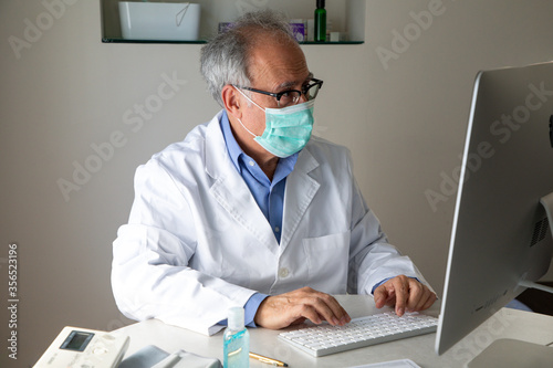 Senior male doctor wearing face mask and medical gown sitting at table and talking with patient via video call on computer while working remotely during COVID 19 outbreak