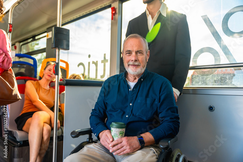 senior, man, wheelchair, public, transport, bus, accessibility, disability, traveler, commuting, urban, smiling, mature, adult, old, mobility, independent, inclusion, passenger, city, life, support, daily, journey, diverse, group, social, modern, convenience, eco, friendly, recyclable, cup, environmental, awareness, confident, active, healthy, lifestyle, day, sunny, indoor, vehicle, sitting, casual attire, transportation, people, man, freedom
