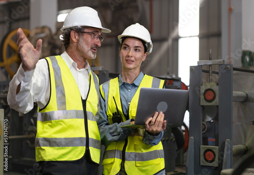 Senior manager train female technician to work in metalwork production factory. Industrial engineer man and woman standing in manufacturing facility talking machinery technology in heavy industry.