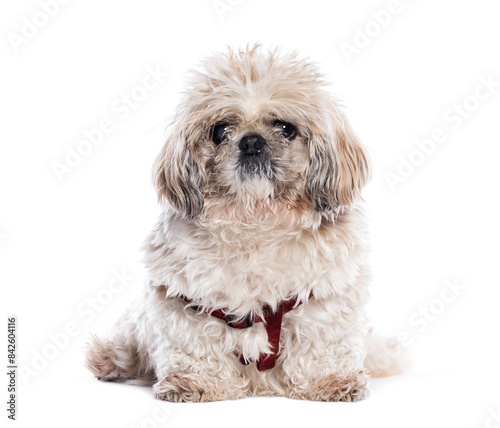 dog, shih tzu, senior, old, pet, animal, cute, white, brown, harness, sitting, looking, curious, studio, isolated, white background, 1, mammal, domestic, breed, purebred, canino, hairy, furry, small, companion, friends, loyal, obedient, adorable, attentive, portrait