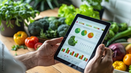 Senior using a tablet to track diet information, healthy fruits and vegetables in focus
