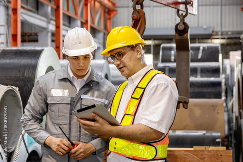 Senior worker with helmet and safety vest holding tablet, discussing with young foreman at industrial site. Diverse team brainstorming while working with machinery together at manufacturing factory.
