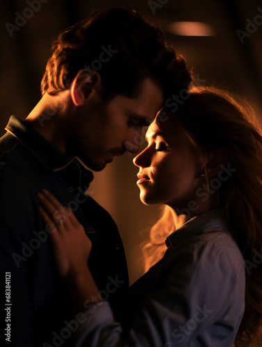 Sensual backlit portrait of a couple, close embrace, low key lighting, intimate atmosphere