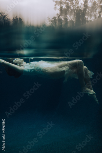 floating, float, sinking, adventure, wet, adventurous, white dress, pool, swimming pool, missy, swimming, water, underwater, fun, discovery, feminine, summer, female, sensuality, sensual, freedom, backyard, overhead, tattoo, spontaneous, leg, closeup, face, emerge, ecstasy, wet hair, butt, foot, ocean, meditation, whimsical, mermaid, los angeles, california, us, 30s, one person, white