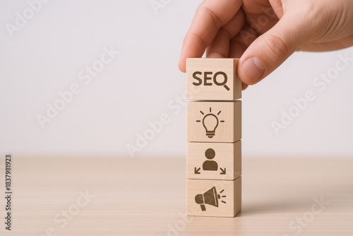 SEO Strategy Concept: Hand Stacking Wooden Blocks with SEO, Idea, User, and Promotion Icons