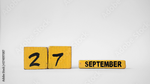 SEPTEMBER 27 Wooden calendar. World Tourism Day. White background with space for your text