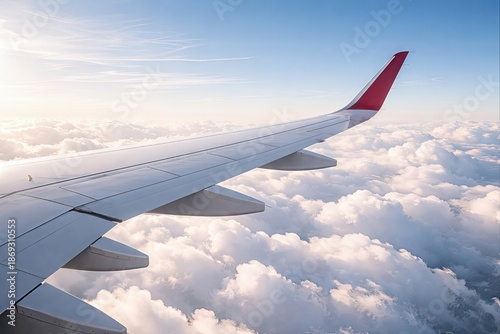 Serene aerial view from an airplane wing gliding through fluffy clouds under a luminous sky evoking a sense of adventure tranquility and freedom for travelers seeking new horizons