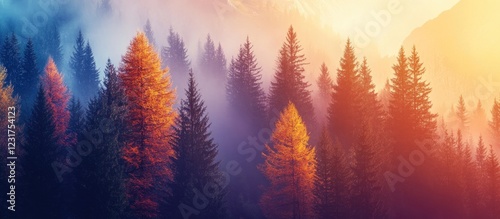 Serene alpine landscape at dawn with autumn hues in trees, vibrant oranges and yellows against misty blue and purple background, creating peaceful ambiance.