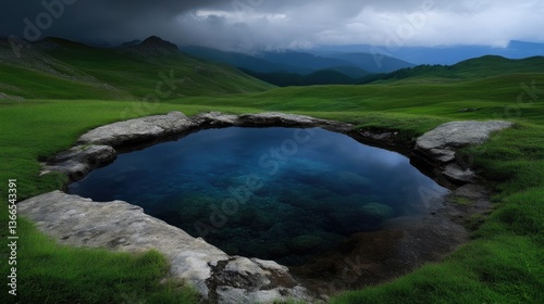 Serene alpine pool nestled in a grassy valley, surrounded by rugged mountains. Crystal-clear water reflects the sky and clouds