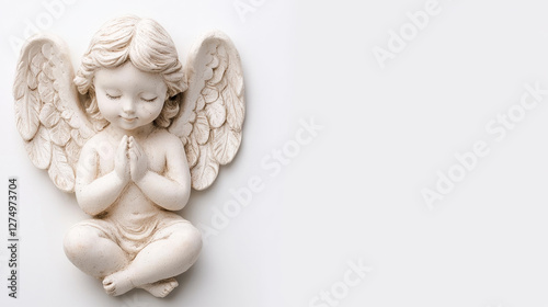 Serene angel figurine with wings and folded hands on white background